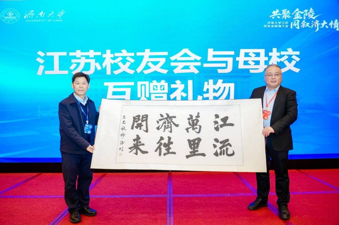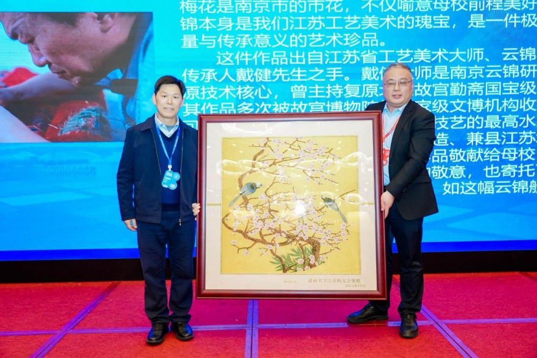 会上举行了江苏校友会“校友企业之家”启动仪式。这一创新平台将有效整合江苏校友资源,为在苏校友的创新创业提供有力支持。黄加栋代表学校向江苏校友会赠送书法作品表示祝贺,毛良喜代表江苏校友会向母校回赠礼物——由江苏省工艺美术大师、南京云锦传统织造技艺非物质文化遗产传承人戴健先生创作的《喜上梅梢》云锦挂画,祝福母校的明天,如这幅云锦般璀璨辉煌。